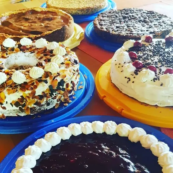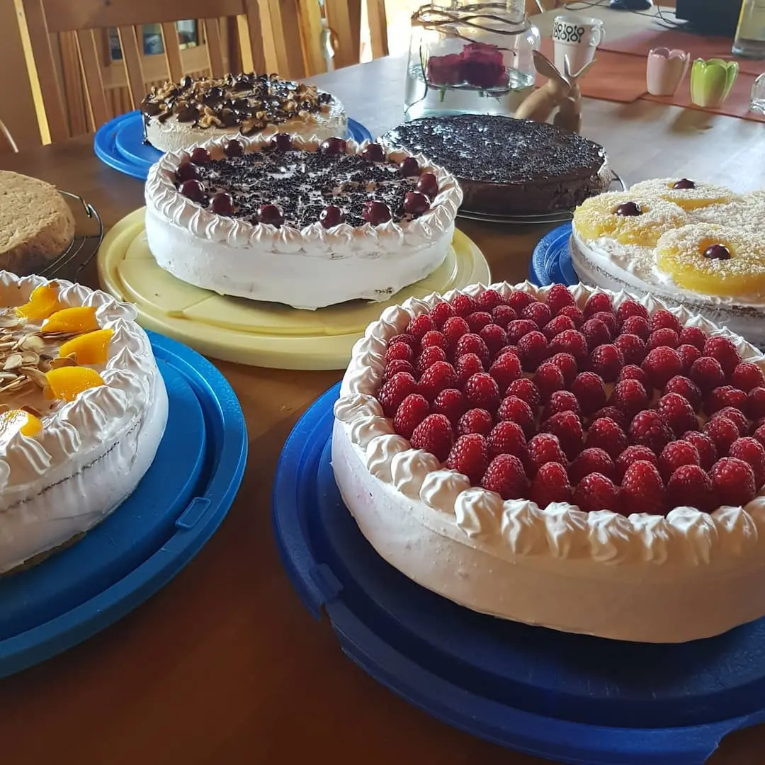 Unsere Kuchen und Torten sind alle hausgebacken mit 630er Dinkelmehl oder , je nach Kuchen, mit Dinkelvollkorn, den wir auf einer eigenen Getreidemühle mahlen. Glutenfreie Kuchen stehen normalerweise auch immer zur Verfügung.